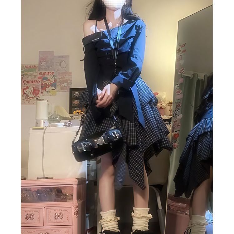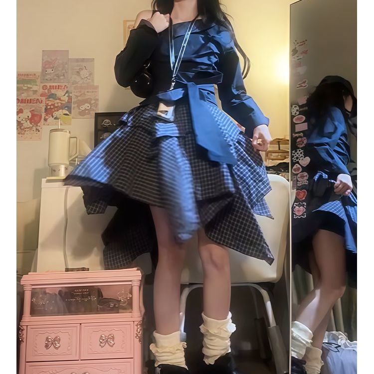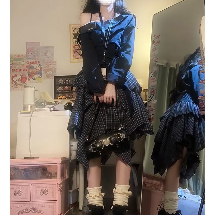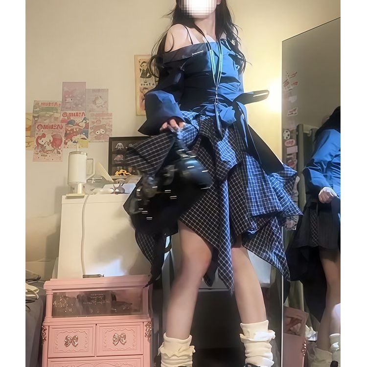 【苏格兰画廊】韩系设计感小众斜肩长袖上衣+不规则吊带裙套装女