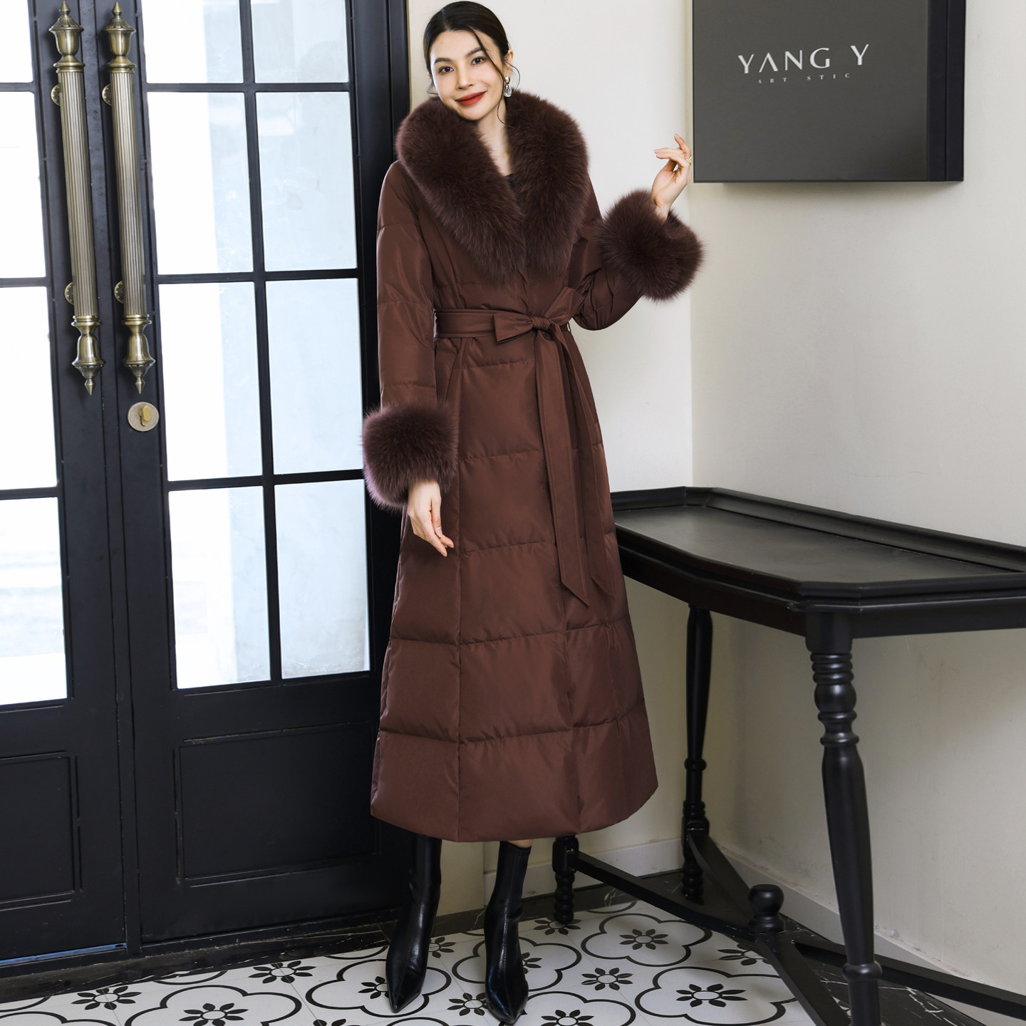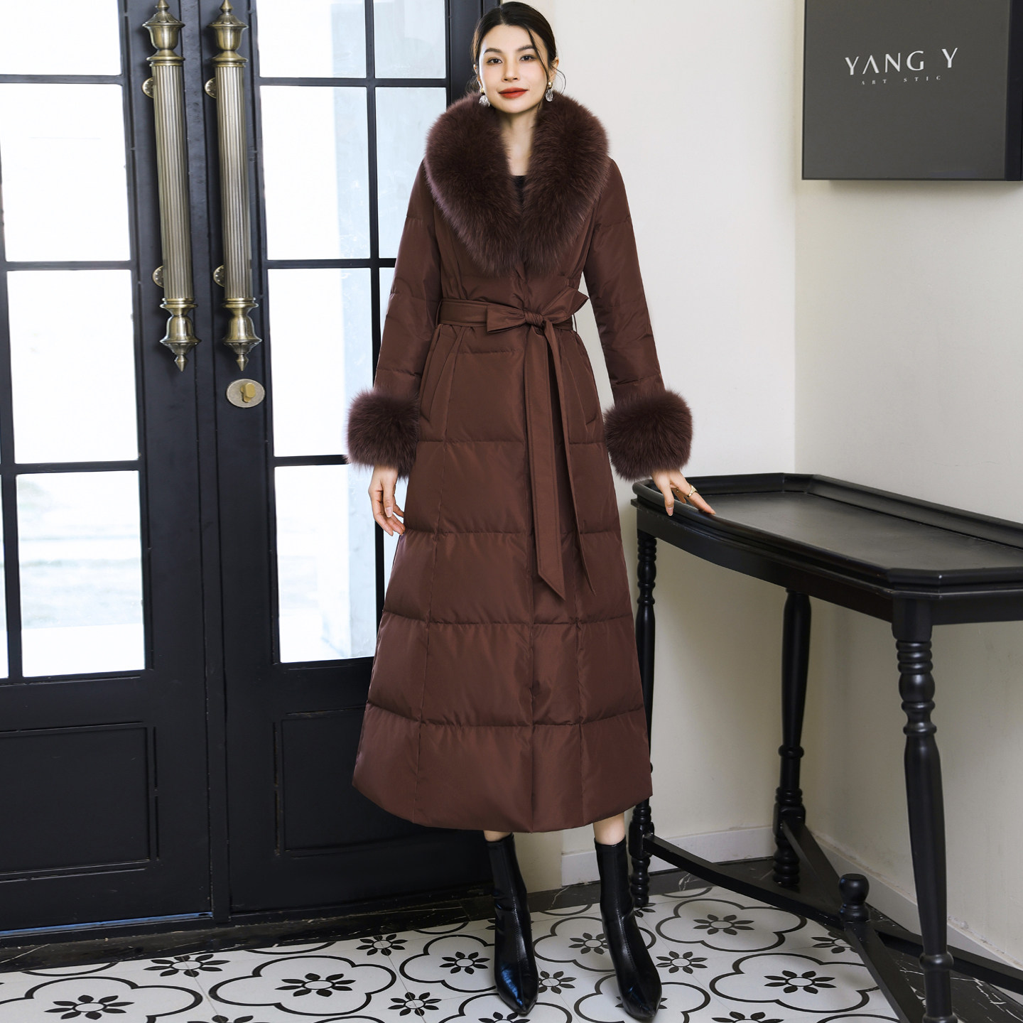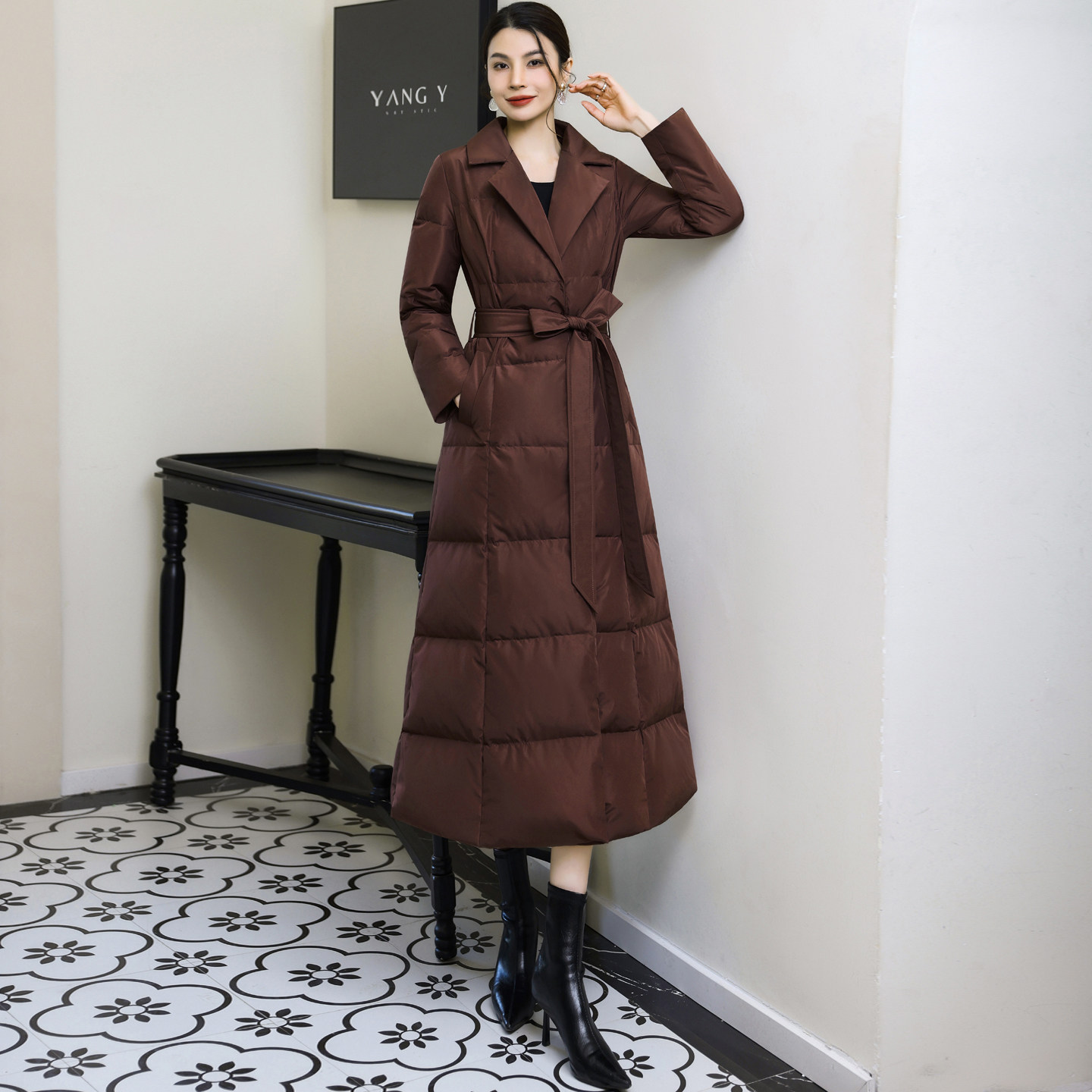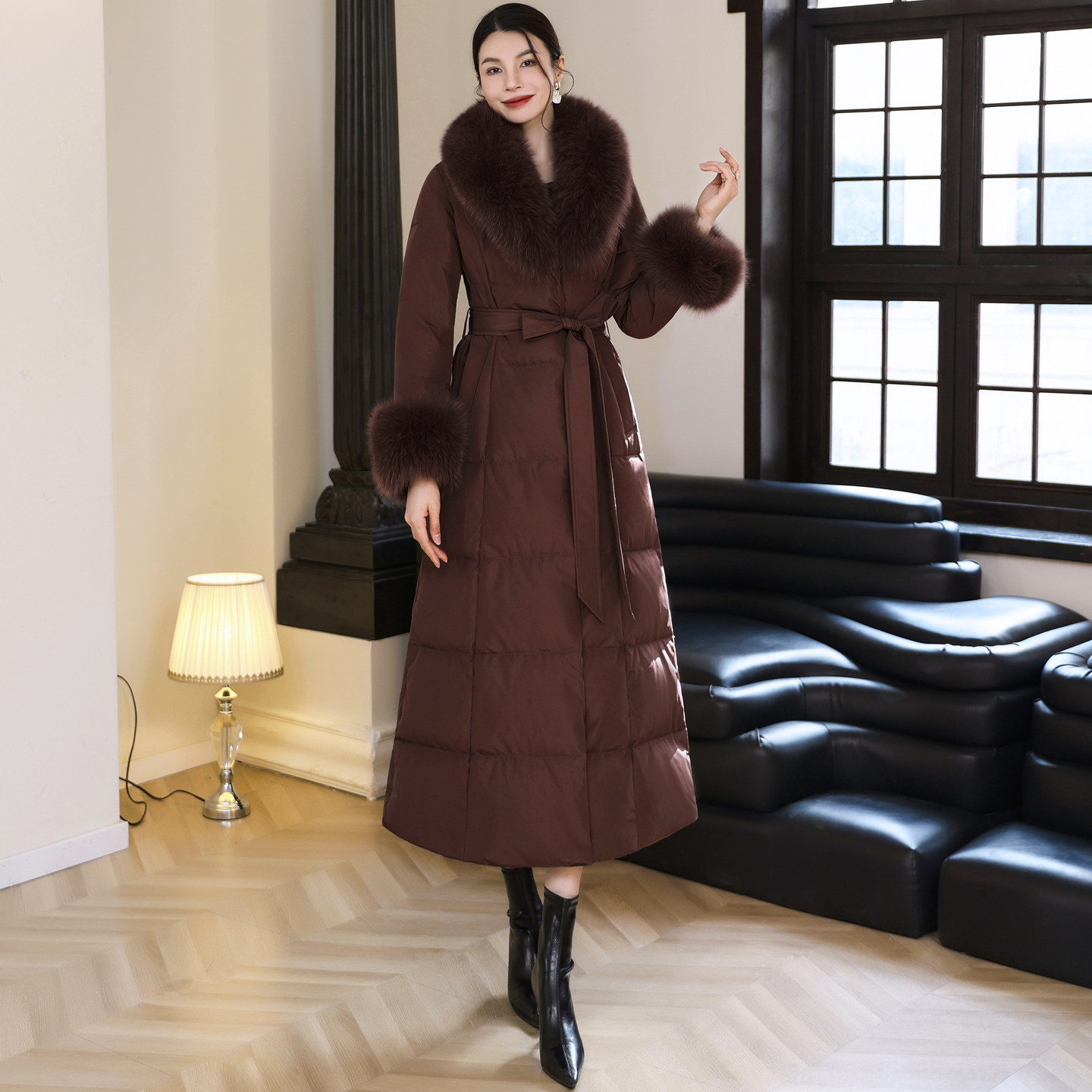 冬季新款显瘦过膝毛领外套长款保暖加厚修身咖啡色西装领羽绒服女