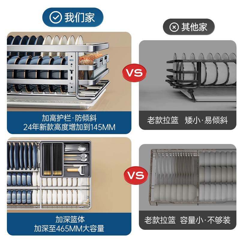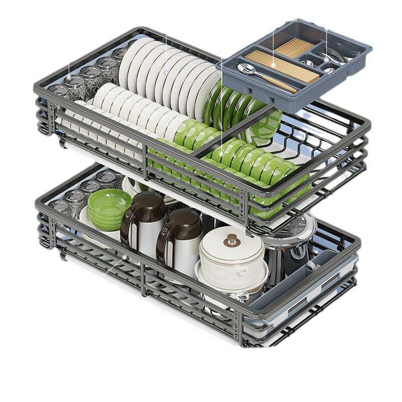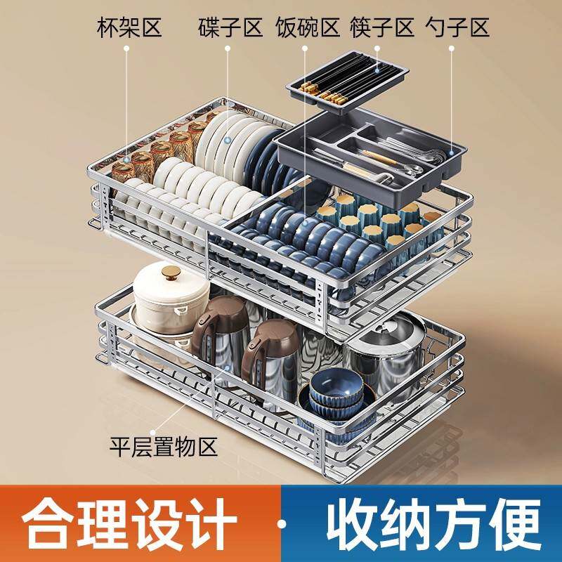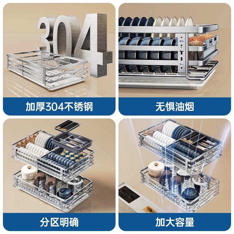 拉篮厨房橱柜抽屉式双层放装碗筷碟架304不锈钢拉篮调味收纳拉蓝
