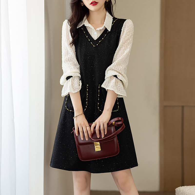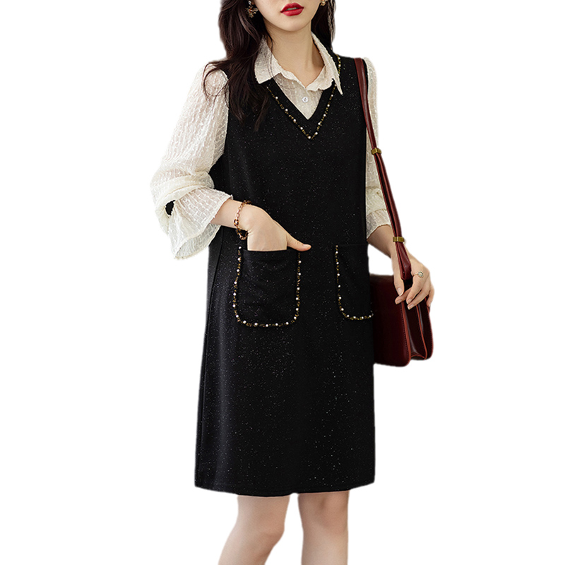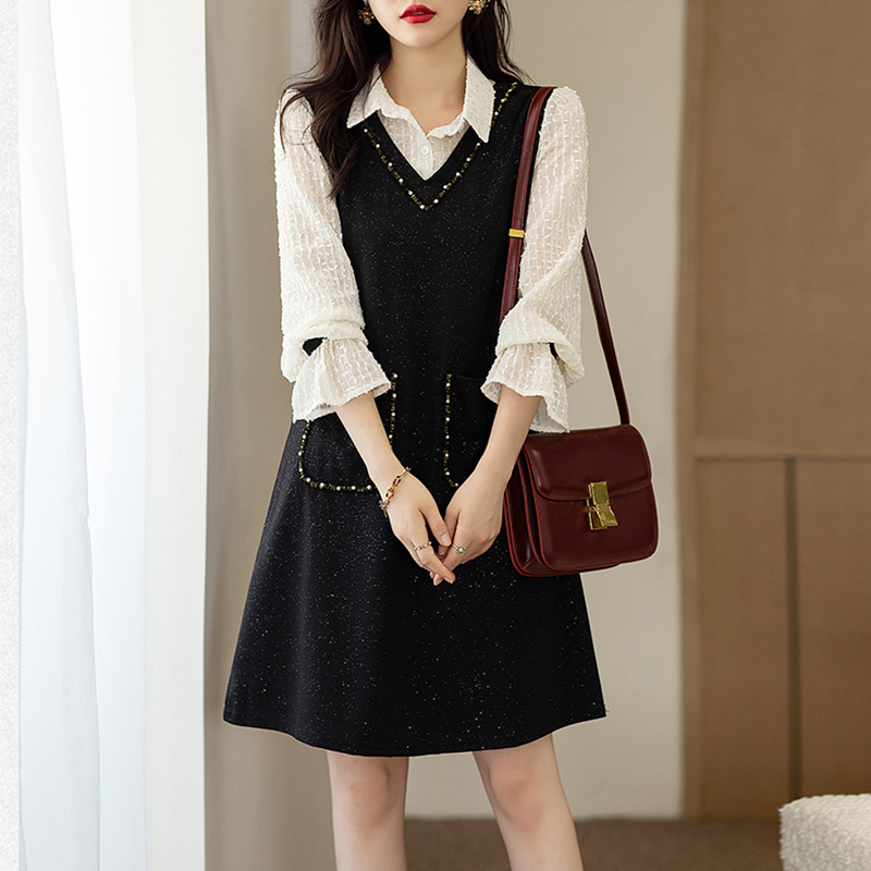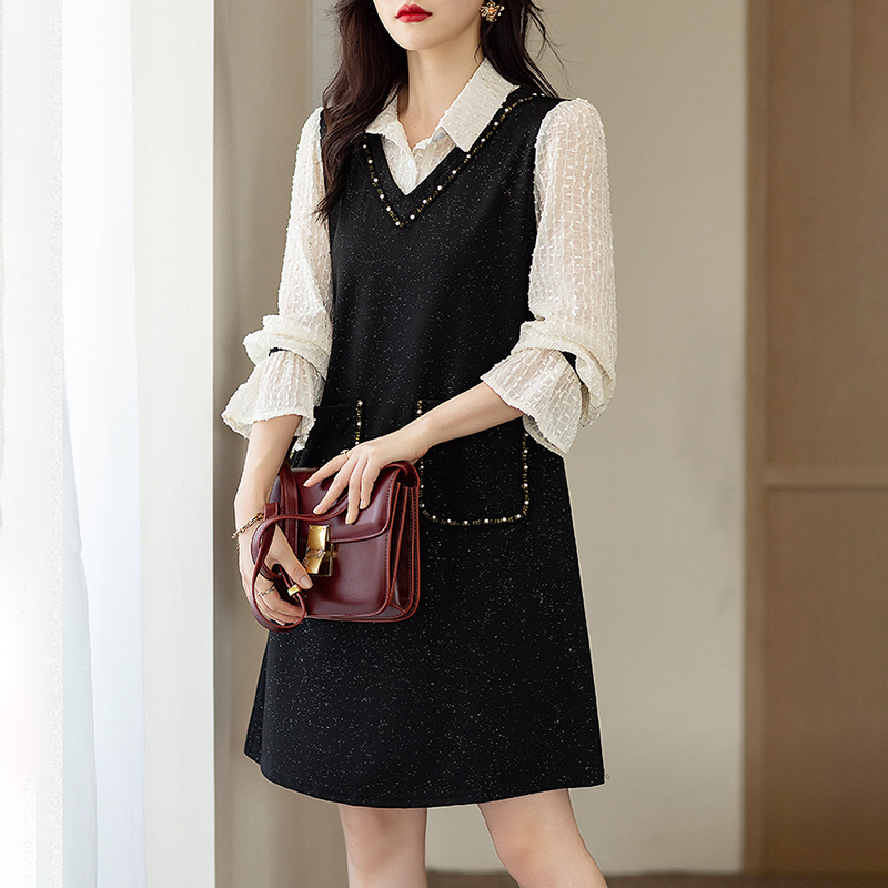 洋装子女士装春秋冬2025年新款假两件大尺码小个子气质洋派中长版