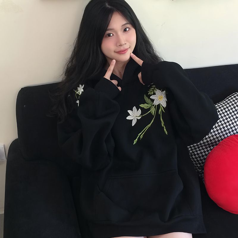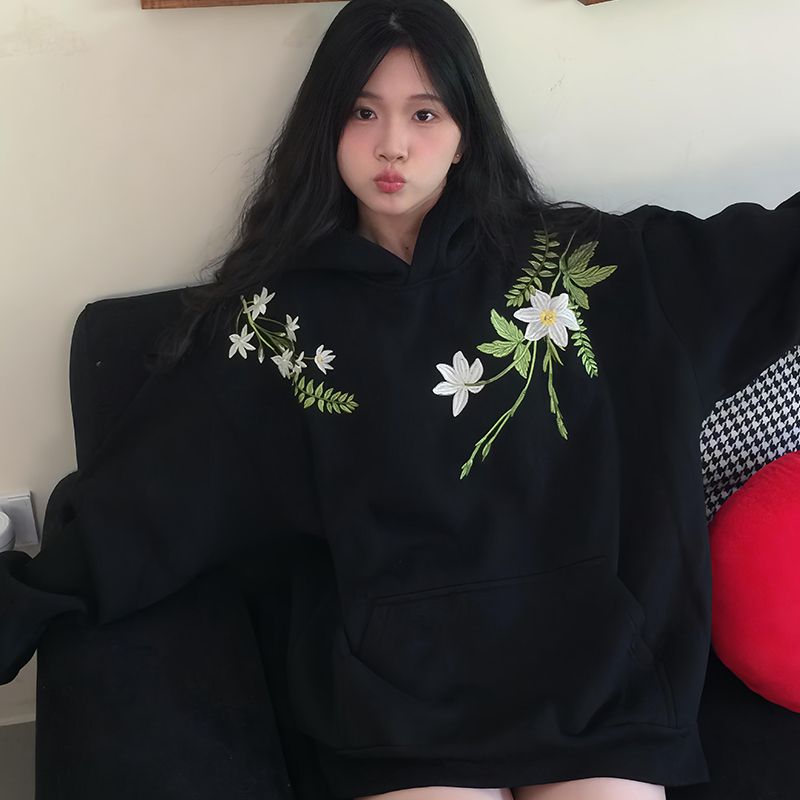 中式潮流花卉刺绣连帽卫衣纯棉秋冬外套上衣宽松百搭