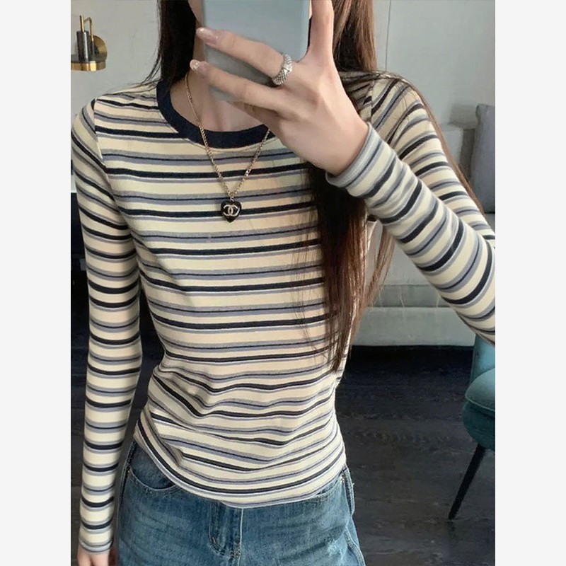 纯棉圆领条纹对比春秋冬女式长袖t恤2025新款覆古紧身上衣