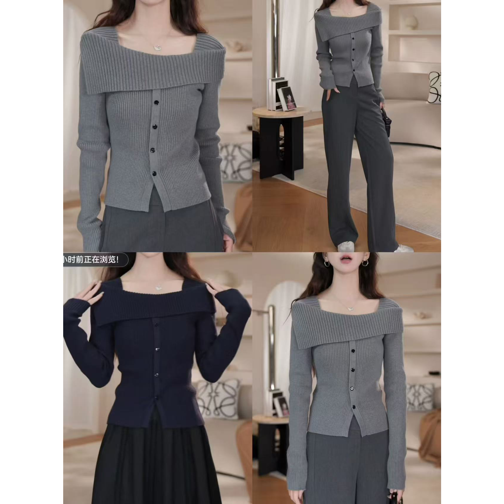 2025秋季新款方领长袖针织衫女温柔风韩系设计感开叉修身显瘦上衣
