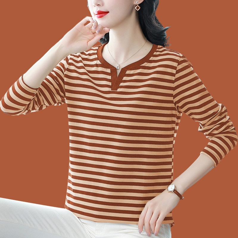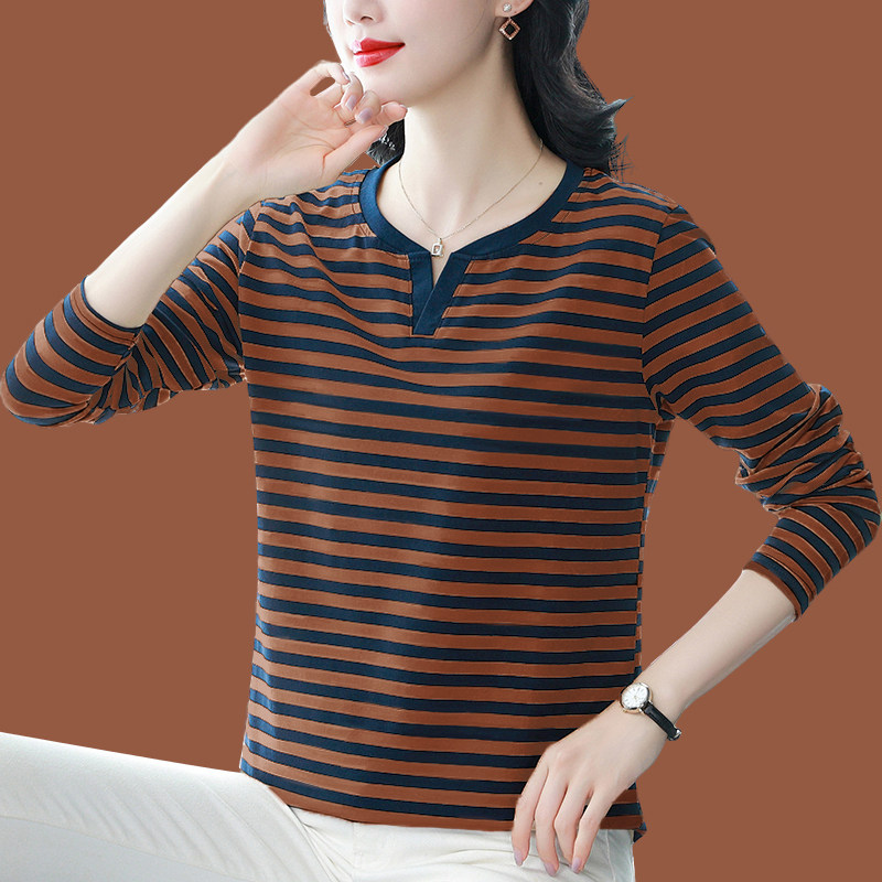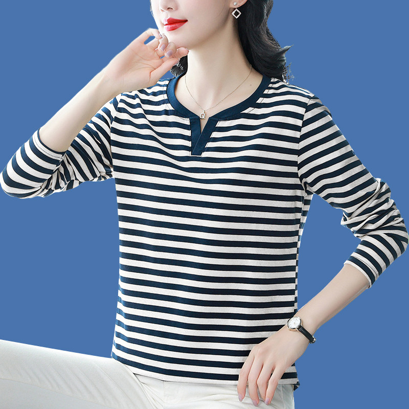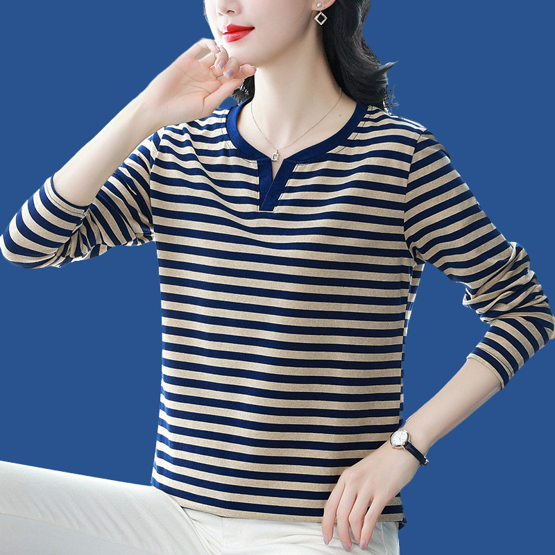 秋季新款纯棉长袖t恤女上衣宽松大码条纹中年妈妈打底衫洋气小衫