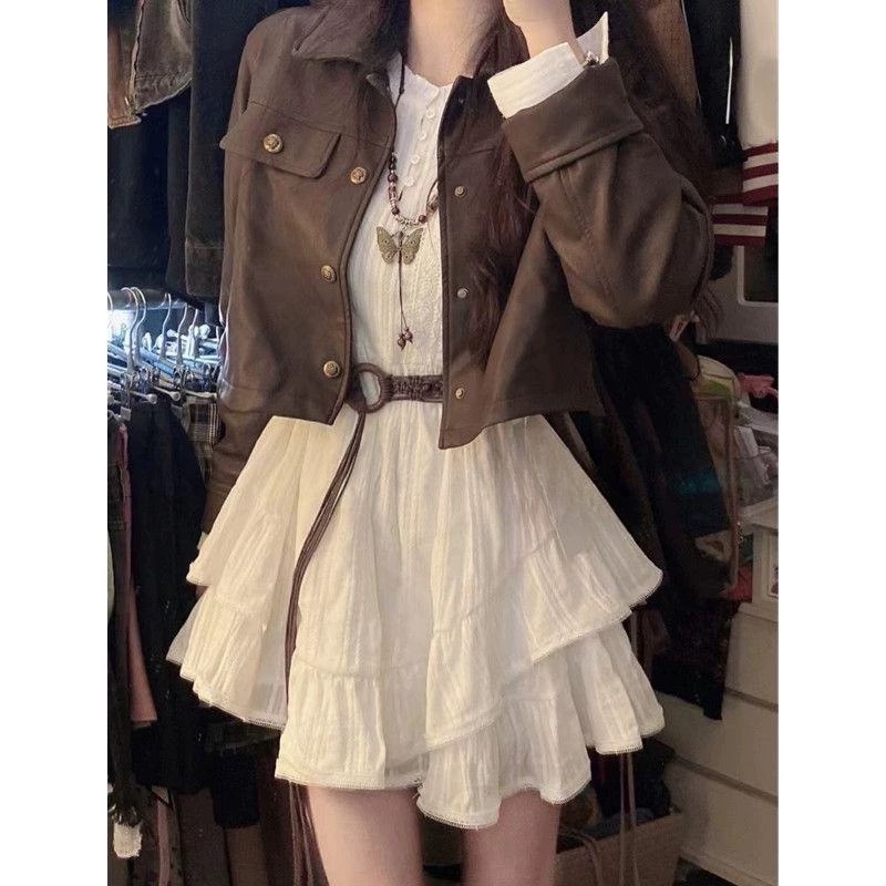 美式经典覆古机车棕色百搭皮克外套+温柔风初恋感收腰小白裙套装