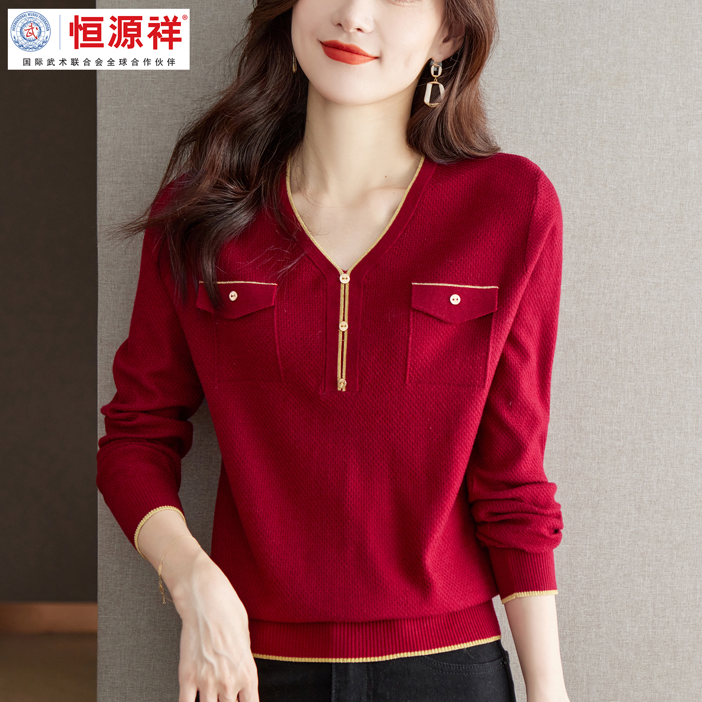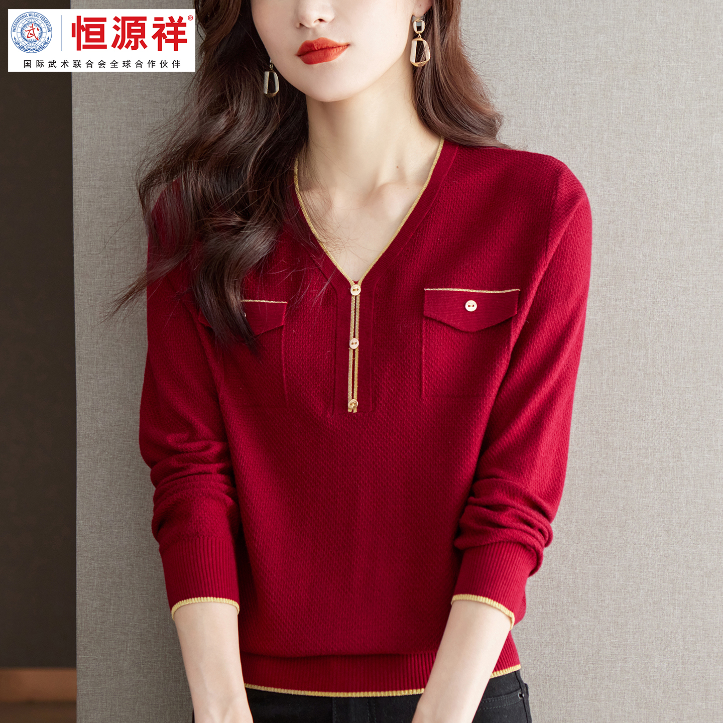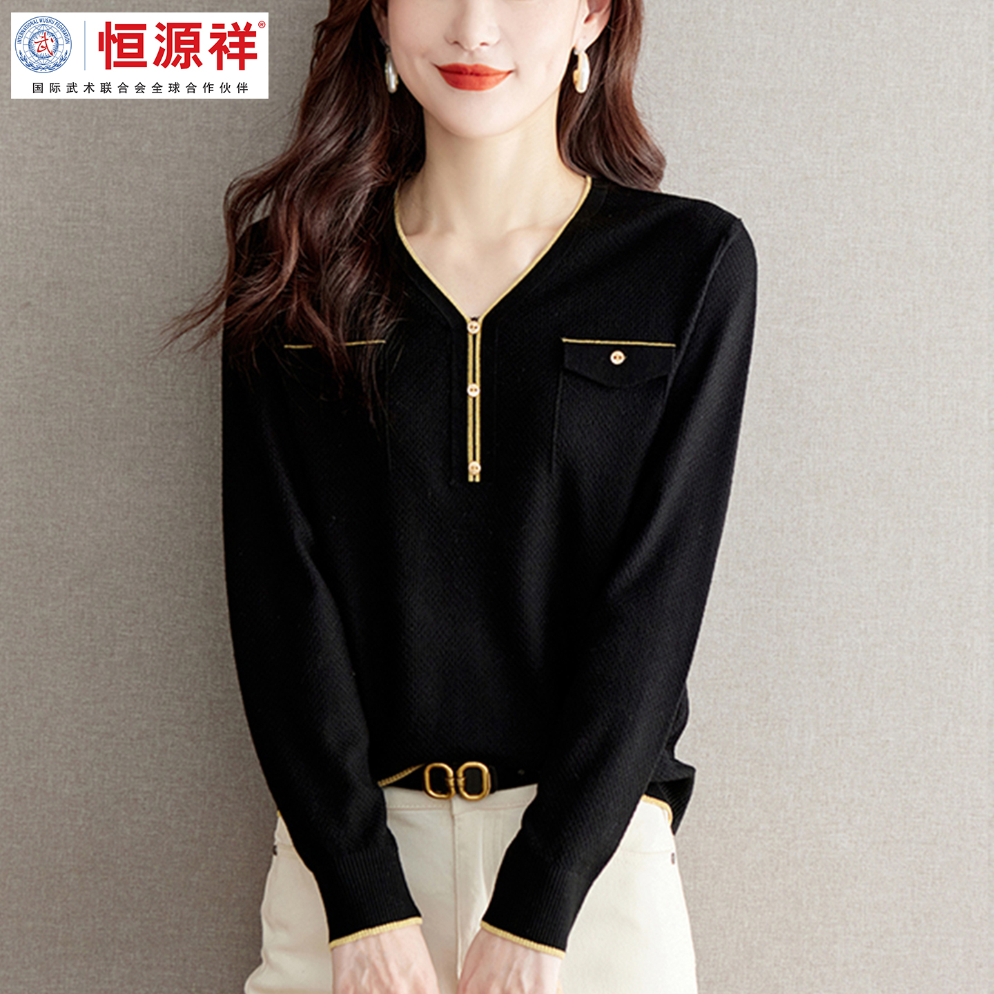 恒源祥彩羊打底衫女秋冬2025新款V领针织上衣高级感长袖t恤毛衣