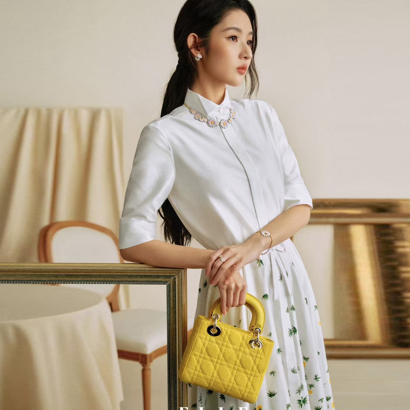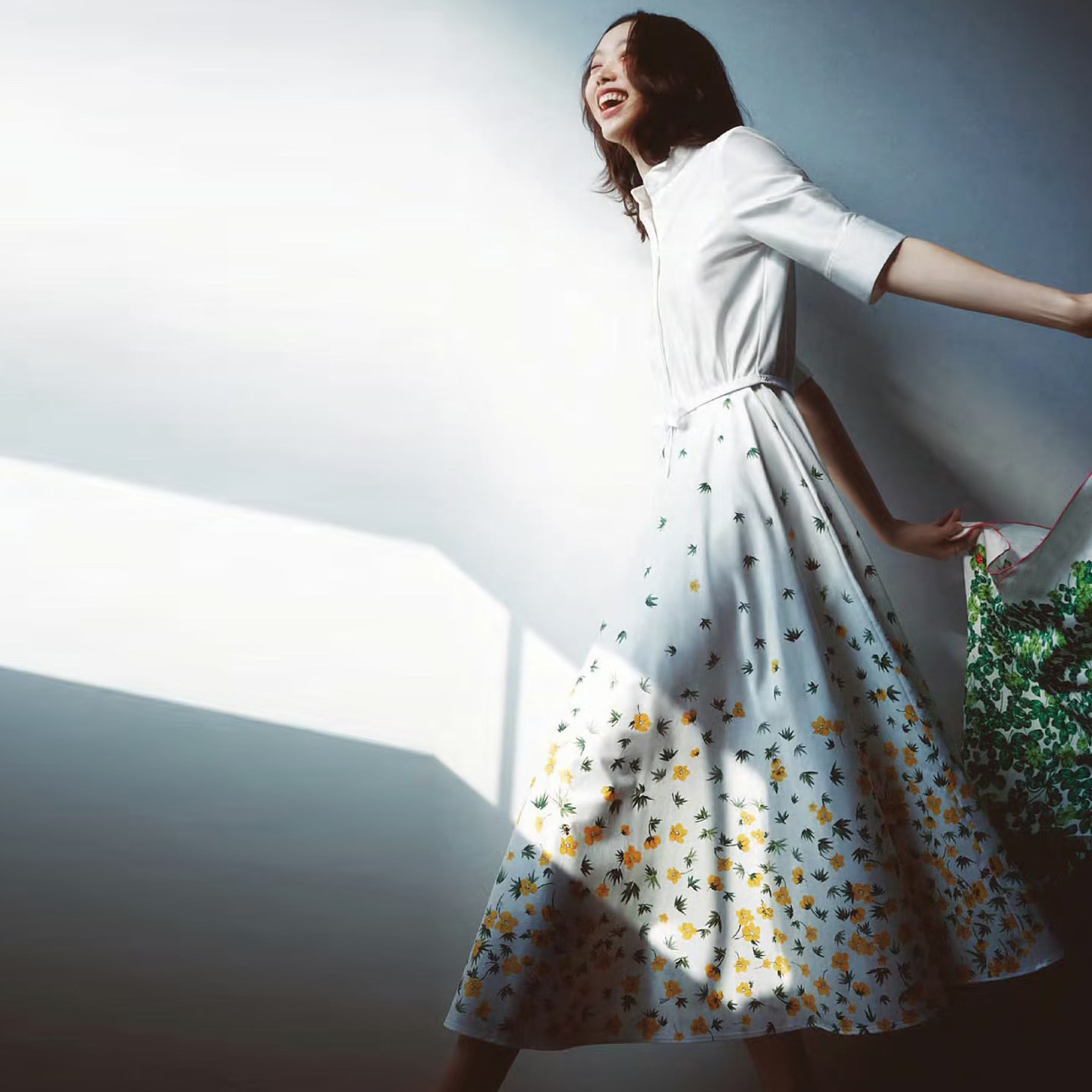 春夏装优雅风白色翻领连衣裙女时尚印花收腰系带长裙碎花裙气质群