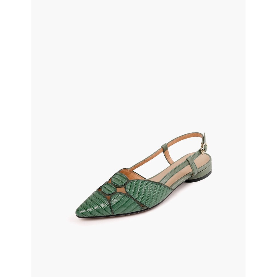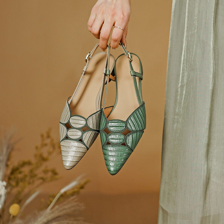 法式优雅低跟包头后空时尚女凉鞋春夏新款鳗鱼纹牛皮尖头平底女鞋