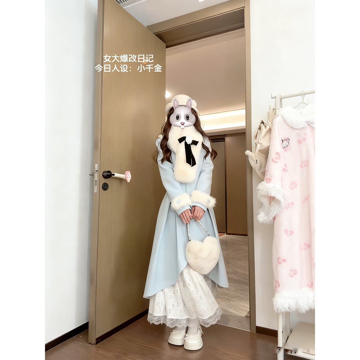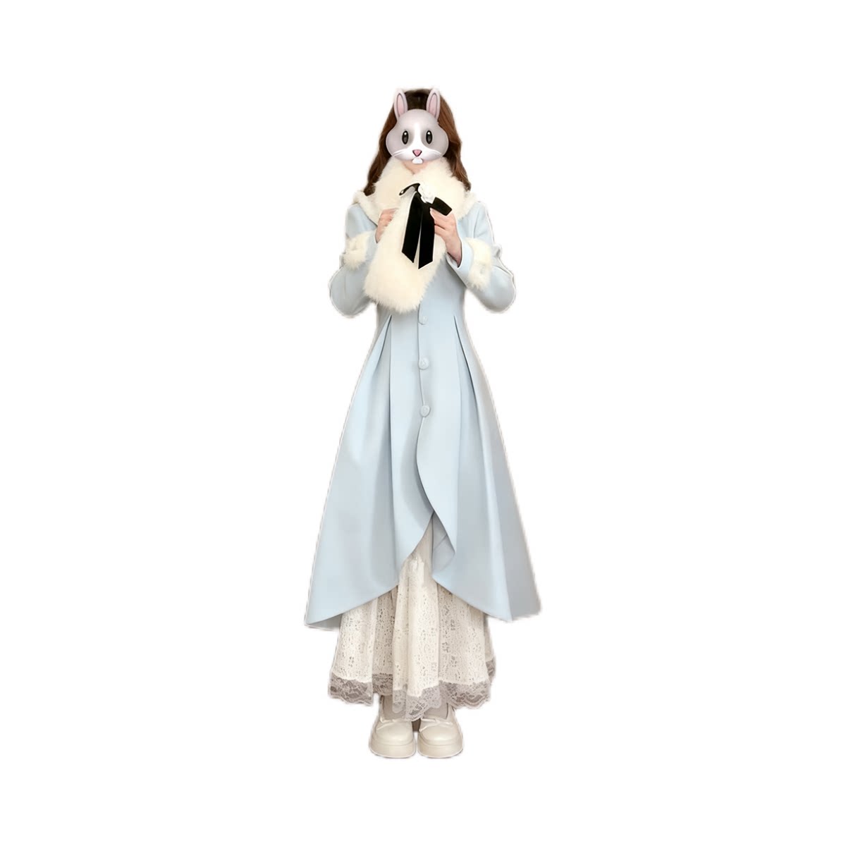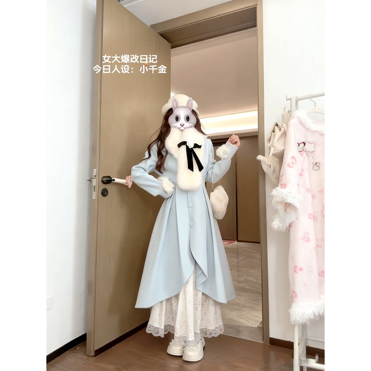 蓝雪绒梦学院风蝴蝶结围巾蓝色毛呢大衣两件套冬新款小众百搭减龄