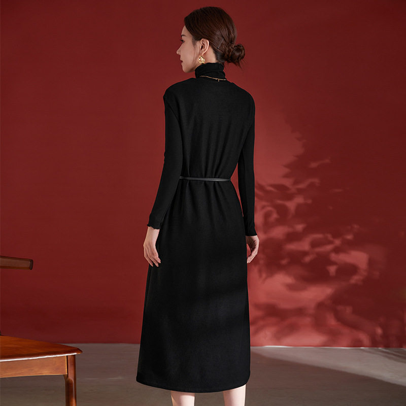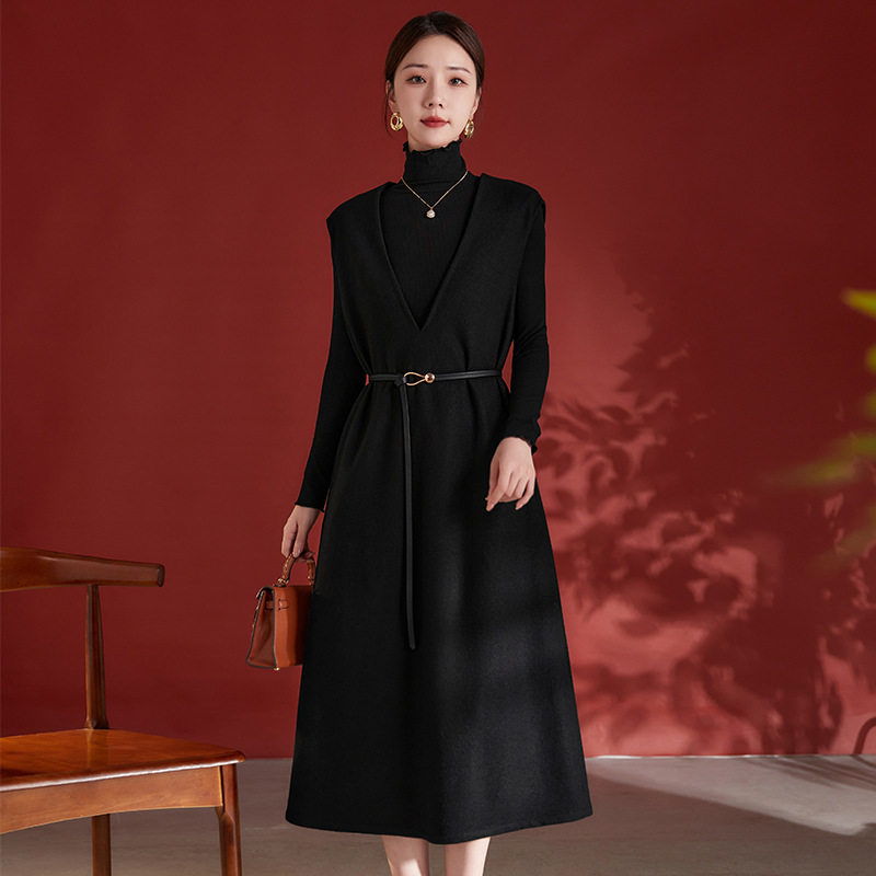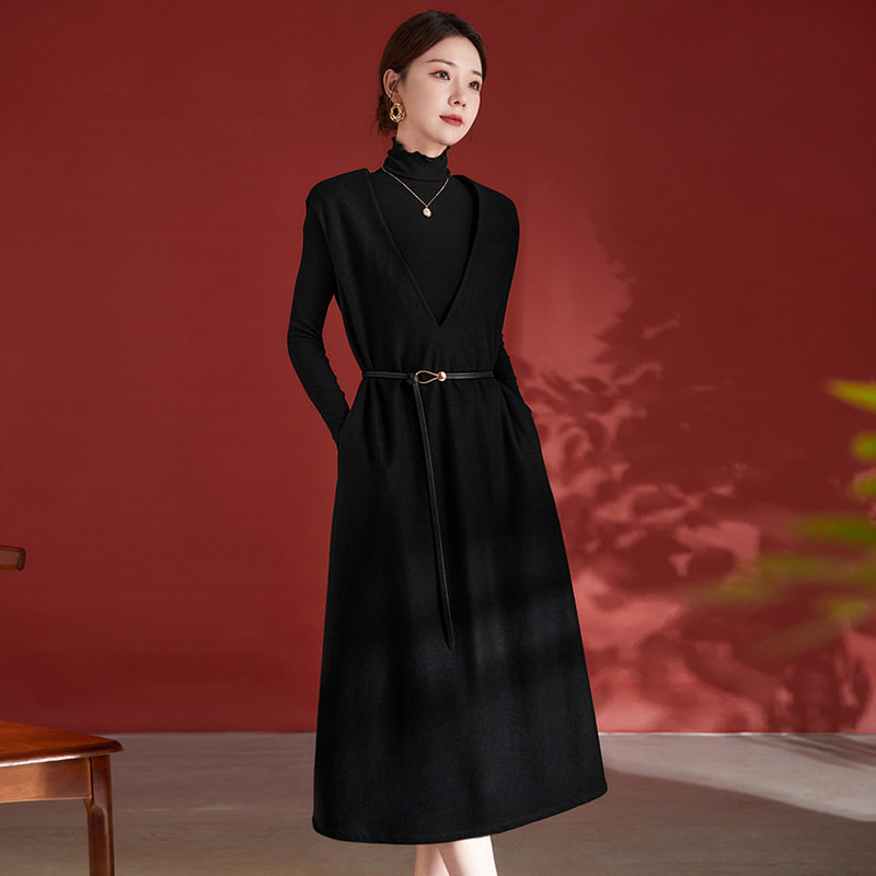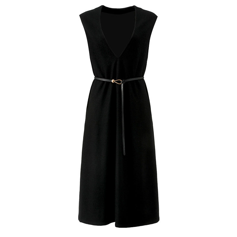秋冬新款轻奢100%绵羊毛V领连衣裙宽松无袖黑色中长裙配腰带7928