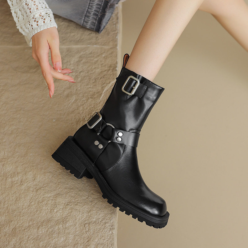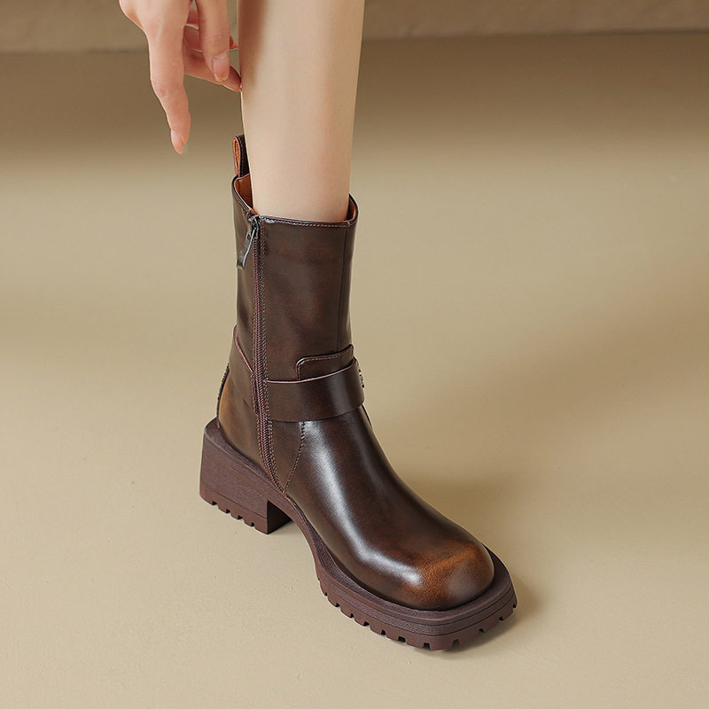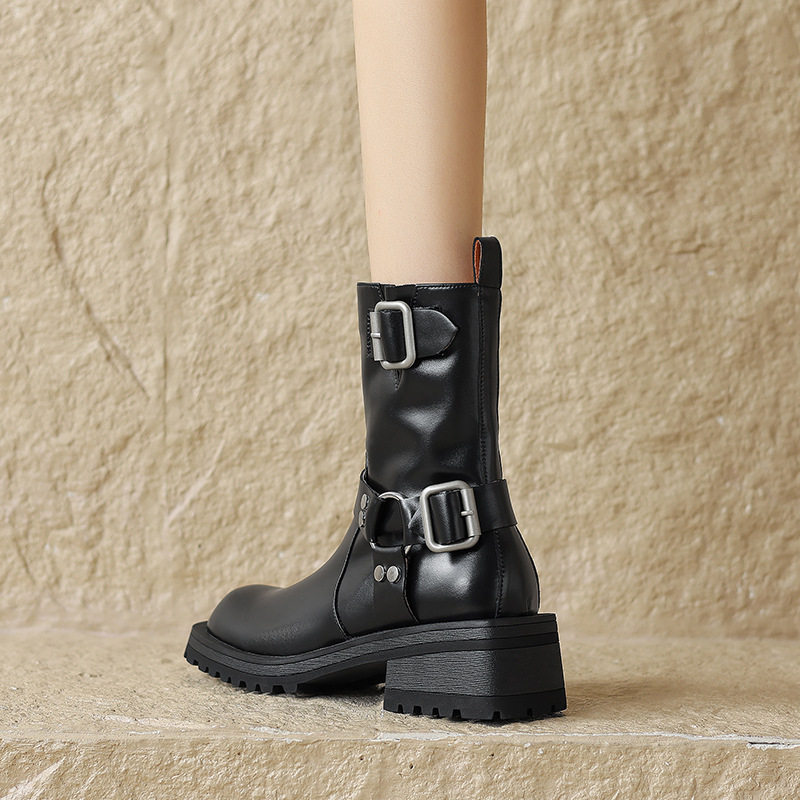 FairyWink 炸街girl~!做旧皮带扣短筒骑士靴女棕色马丁靴短靴