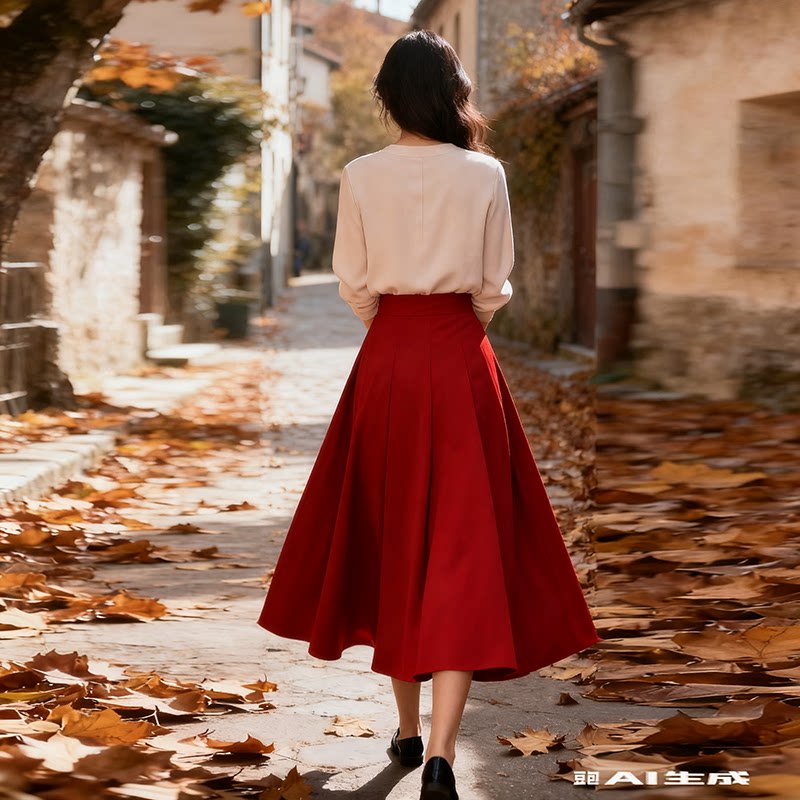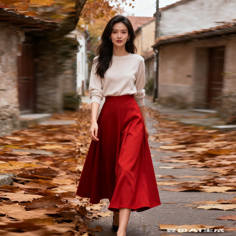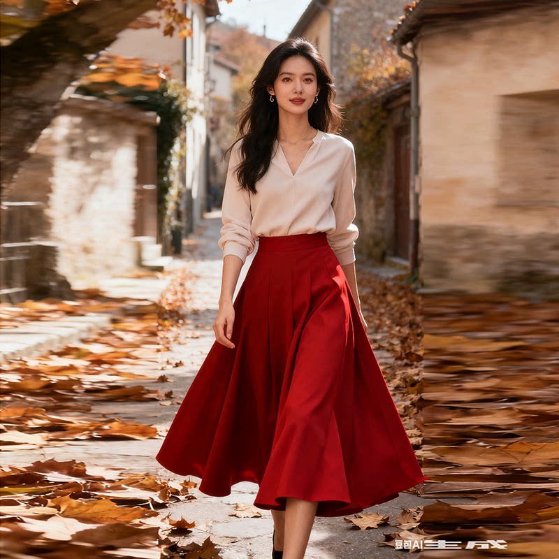 秋装新款气质半身裙法式超仙高腰垂感显瘦a字大摆中国红修身长裙