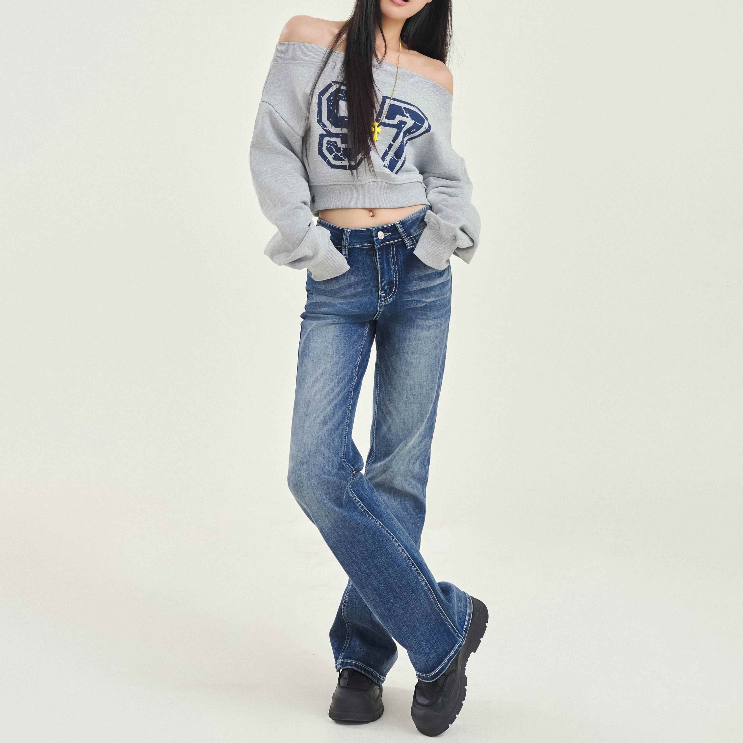 VMZM2025年春秋新款复古水洗蓝色直筒牛仔裤女高腰显瘦垂感拖地裤