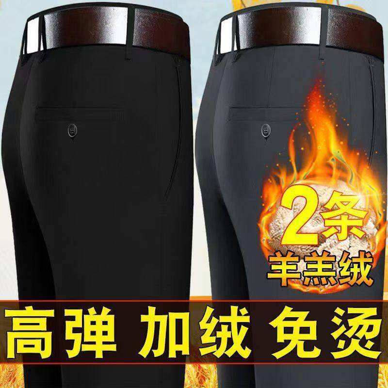 冬季男士裤子加厚款羊羔绒男裤直筒弹力高腰保暖中老年人商务西裤
