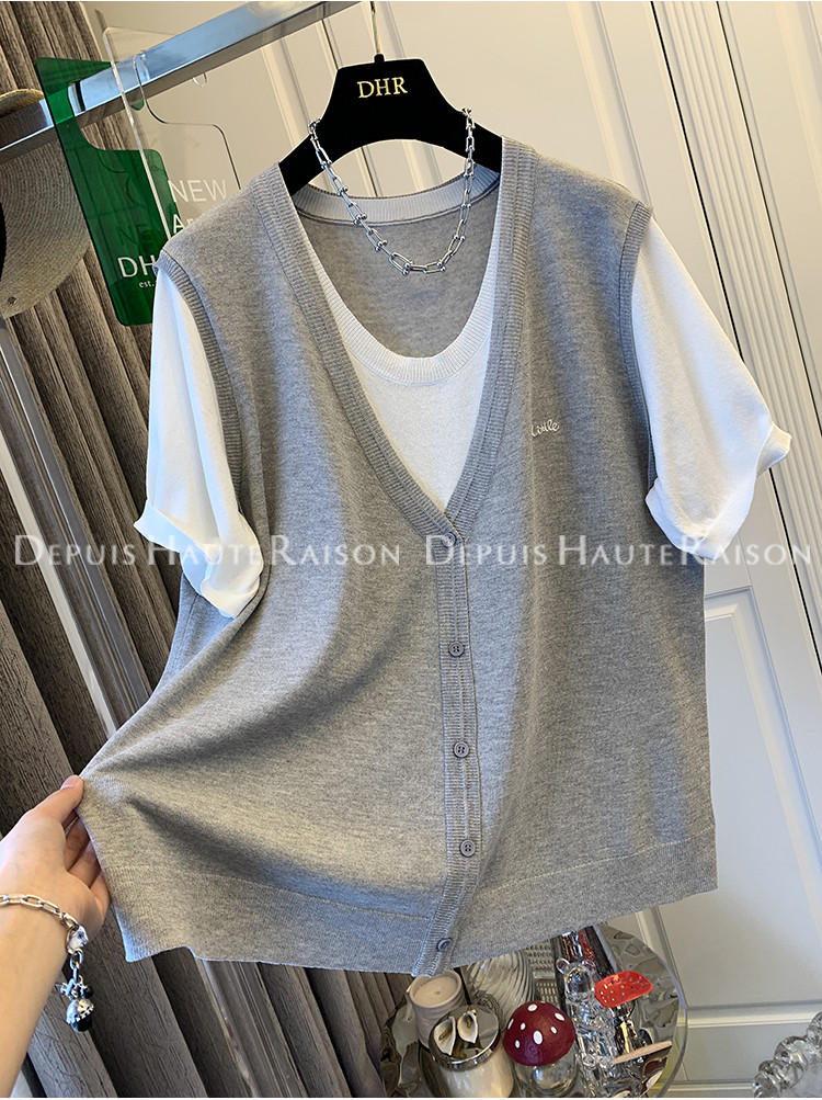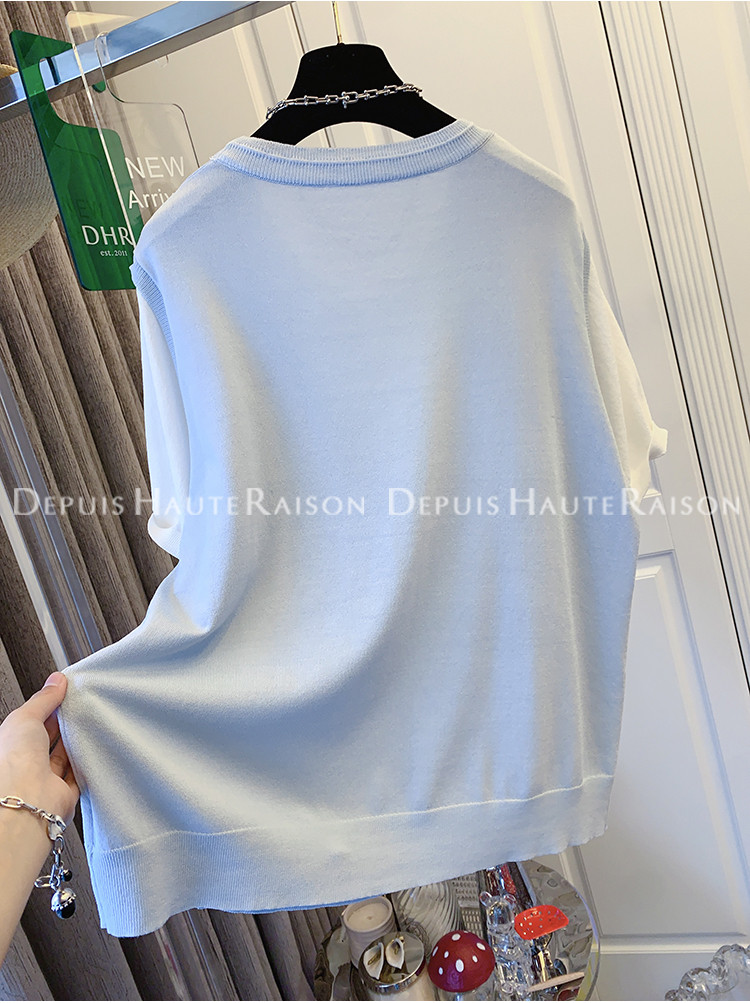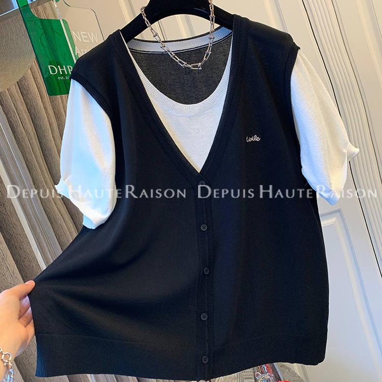 胖mm特大码300斤新款冰丝短袖拼接假两件针织衫薄款宽松T恤上衣