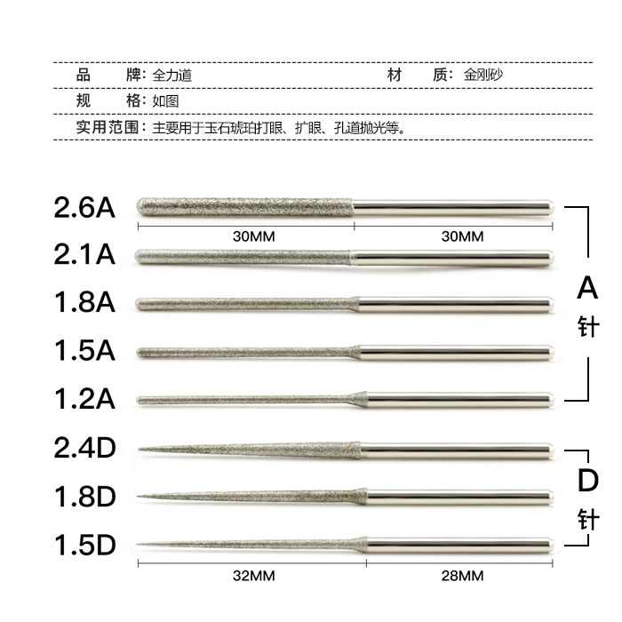 加长A针2.35mm柄径D针扩孔针尖针孔道抛光金刚砂细砂磨头世新磨针