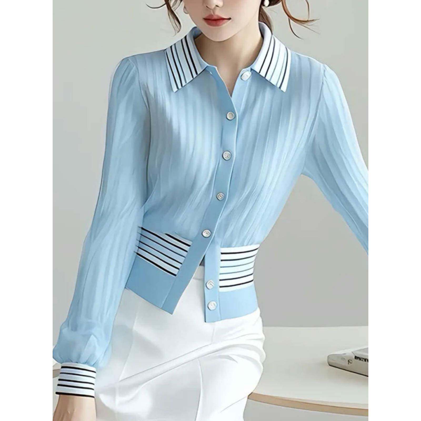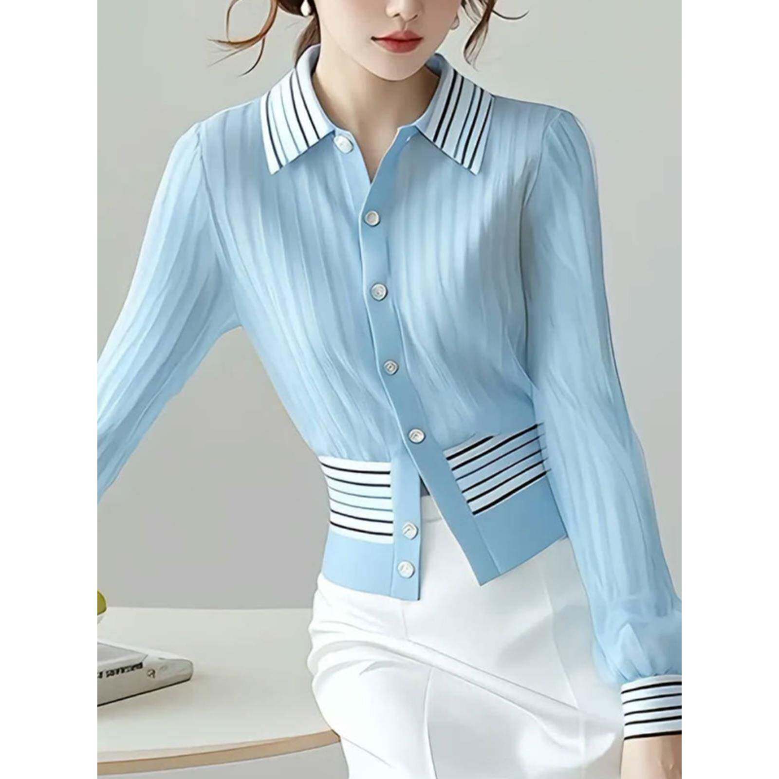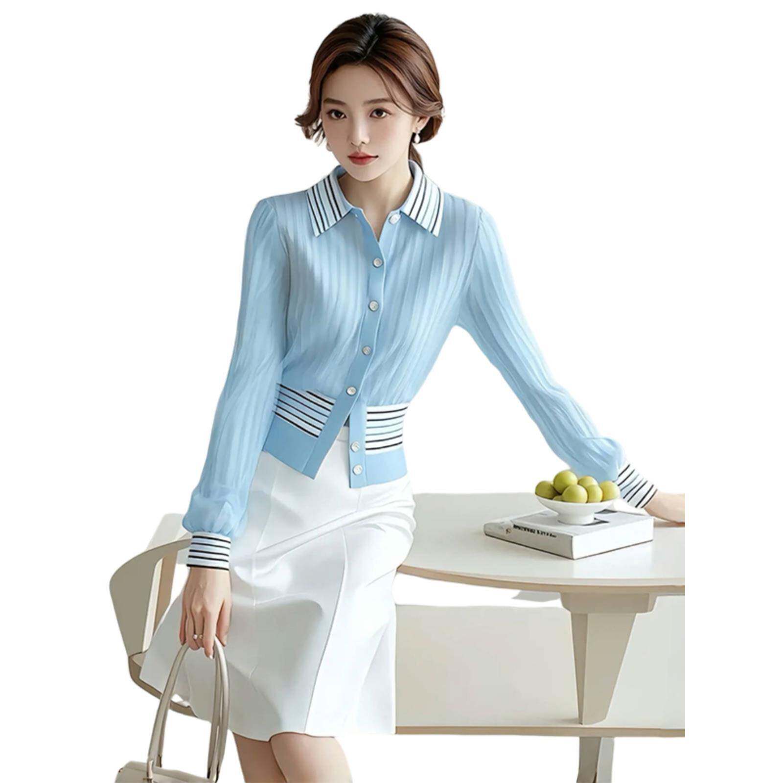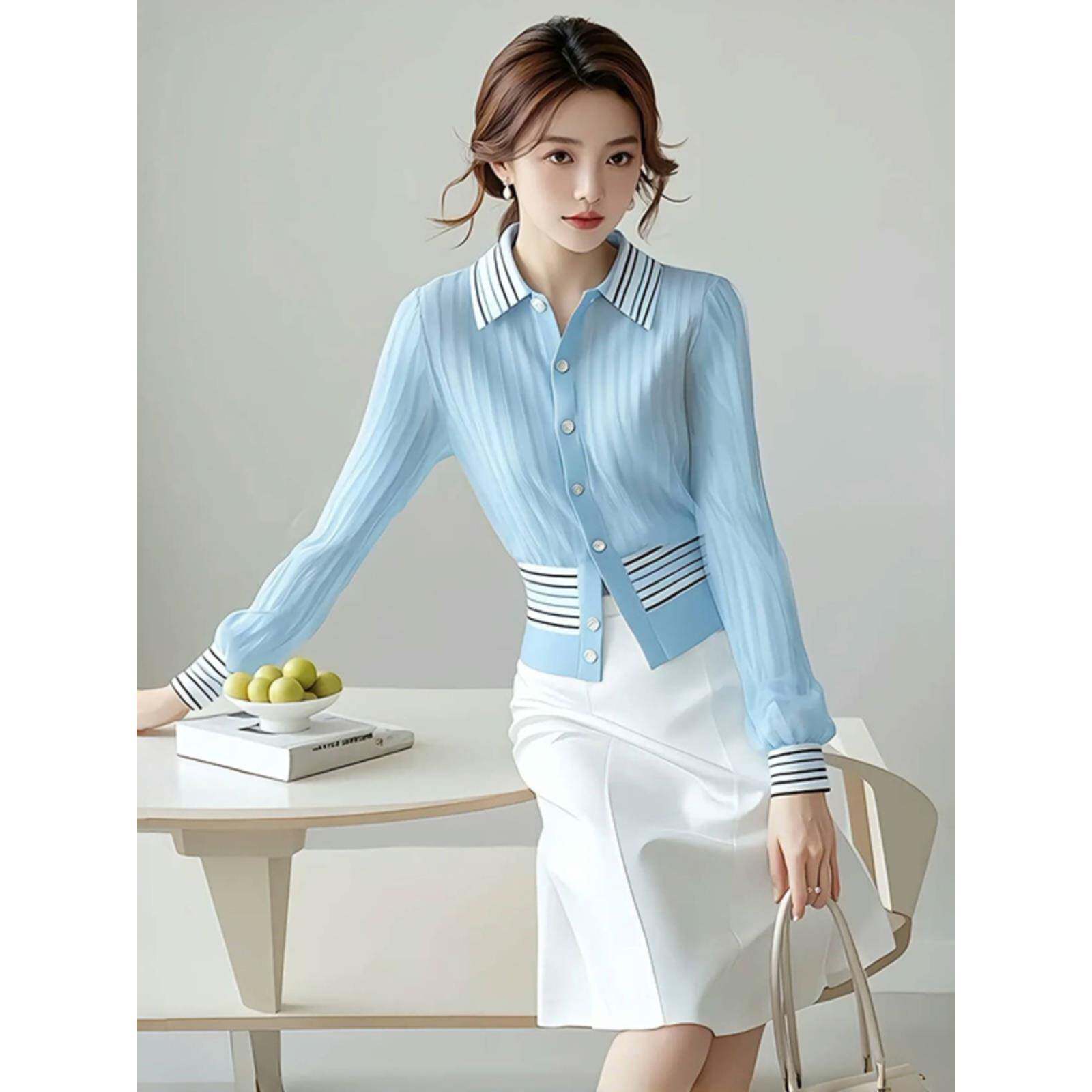 蓝色翻领暗纹开衫衬衫2024早秋季新款女硫酸铜穿搭轻奢高级感上衣