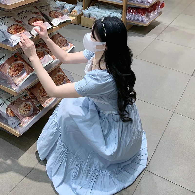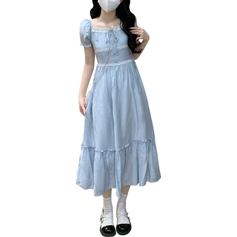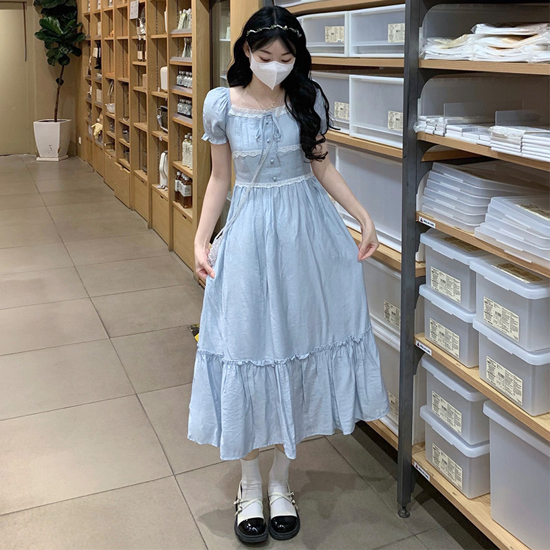 女大童蓝色法式连衣裙夏季2025新款初中生复古蕾丝花边泡泡袖长裙