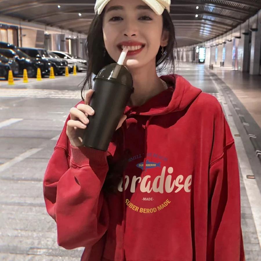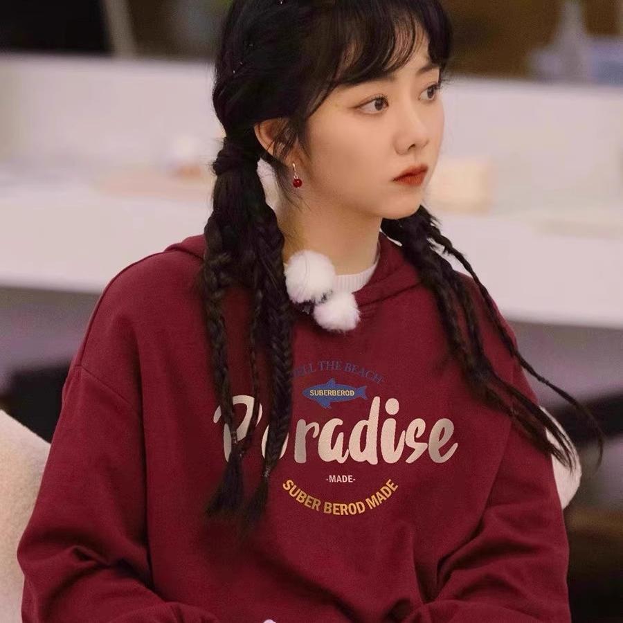 明星古力娜扎同款酒红色卫衣女装初秋高级感港味复古chic上衣外套