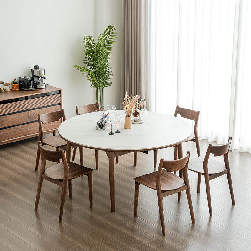 黑胡桃木折叠圆桌可伸缩餐桌可变方桌实木岩板大理石吃饭桌椅组合