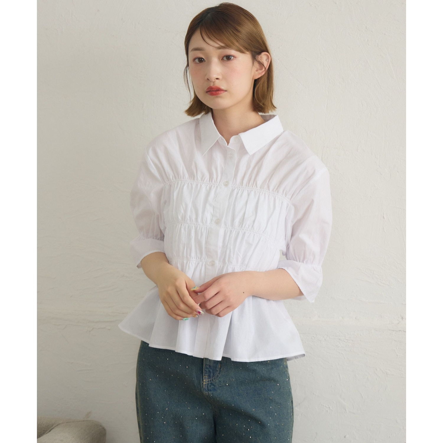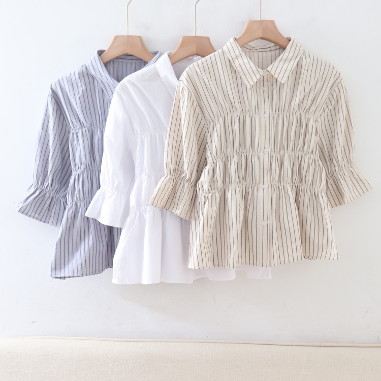 首页> 女装> B070101日单新款单排扣宽松司马克弹力松紧女气质通勤喇叭袖衬衫